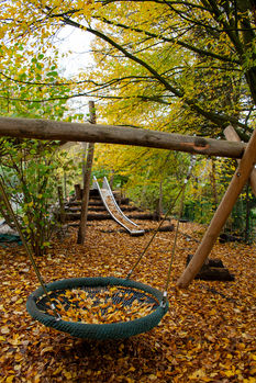 Es gibt eine Hügellandschaft mit Sandkiste, Kletterbaum, Hangrutsche und Feuerstelle. Außerdem stehen den Kindern ein großer Kletterturm mit Hängebrücke und eine Wasserspielanlage zur Verfügung. Die Kinder können sich auf verschiedenen Schaukeln und beim Werken im Urwald, in dem auch ein Bauwagen steht, austoben. Das kleine Weidentipi bietet sich als Rückzugsort an.